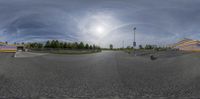 A straight road in Berlin, bordered by modern architecture and an industrial factory. Multicolored clouds fill the clear sky over an open space. Urban landscape with concrete surfaces and vegetation.