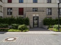 A modern residential building in Berlin, Germany. The architecture features clean lines and large windows. The house is surrounded by grass and vegetation, adding to the urban design. The city life is captured in this image, along with the hard shadows and cobblestone road.