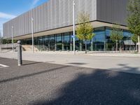 A stunning example of modern architecture in the heart of Berlin. This large building, with its sleek facade and contemporary design, is situated next to a road lined with trees. The road surface, shaded by the clear sky above, is made of smooth asphalt, giving the urban area a clean and sophisticated appearance. The building serves as a part of the city's urban design, enhancing the residential area and showcasing the architectural excellence found throughout Berlin. The nearby parking lot provides convenience for visitors and residents alike. This photo captures the vibrant energy and city life that Berlin is known for, with its bustling streets and unique blend of historic charm and modernity.