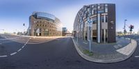this is an image of a modern city street view taken from the inside out of a fish eye lens