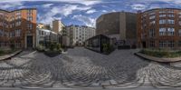 a street view in a spherical lens with buildings and benches around it that have been painted