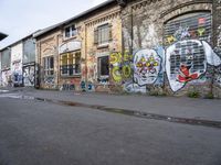 a mural in a back alley near a brick building with graffiti all over it's walls
