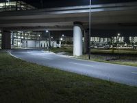 This is an image of a modern architecture bridge in Berlin, Germany. The night scene showcases the illuminated bridge, street lights, and artificial lights that create a dramatic effect. The road surface, made of asphalt and concrete, leads to an underpass beneath the bridge. The surrounding grass and vegetation highlight the urban landscape of Berlin. The city's infrastructure, including highways and buildings, are signs of a bustling metropolitan area. This photo captures the essence of Berlin's contemporary architecture and its vibrant atmosphere at night.