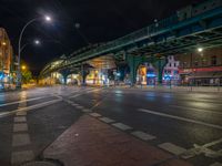 Night view of Berlin city life. Urban design features artificial lights illuminating the dark streets. Traffic lights and street lights guide the road beneath bridges and underpasses. A glimpse of Europe's urban charm in Germany.