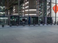 Nighttime in Berlin, showcasing modern urban design and futuristic architecture. Glass walls reflect artificial light, creating a cityscape with open spaces. A blend of dark and light surfaces in a European city.