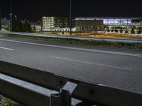 Nighttime view of a road in Berlin, Germany. Modern architecture and artificial street lights illuminate the urban landscape. The empty parking lot and dark surroundings create an eerie atmosphere.