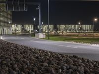 A dark night in Berlin, Germany. The modern architecture of the city shines through the artificial lights. An empty road leads to the large industrial area, creating a surreal atmosphere.
