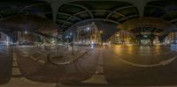 Night view of Berlin city where urban design meets European flair. Street lights illuminate the dark cityscape with light streaks from traffic. A bridge spans over an underpass creating an open space in the urban landscape.