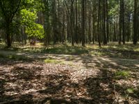 a person is playing a game of frisbee in a wooded area full of trees