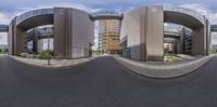 A modern cityscape in Berlin with three circular office buildings on a residential street. The straight road leads to the business district, surrounded by urban architecture. Clouds fill the sky above the city.