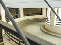 This is an image of a modern building in Berlin, Germany. The architecture showcases clean lines and a mix of materials such as concrete, glass, and steel. The exterior features a parking deck with asphalt surface. Inside, the interior design includes a spiral staircase with metal handrail and glass guard rail. The floors are made of high-quality flooring and the ceilings are plastered. This property represents contemporary real estate in Europe. It is a perfect example of the innovative and modern architecture found in Berlin, Germany.