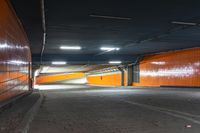 a photo of the side walk of a tunnel at night, with orange walls and lights