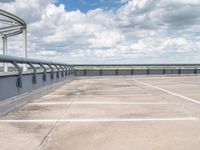 an empty parking lot under a cloudy blue sky with clouds in the background by the bridge