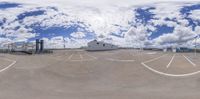 a view of a parking lot and some clouds in the sky from a fisheye lens