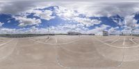 an angle view of a very wide empty parking lot as seen through a fish eye lens