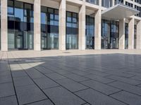 Modern architecture in Berlin's business district. A tall building with glass walls and columns overlooks a tiled square. Clear sky highlights the sleek facade and open space. A prime example of Europe's contemporary design.