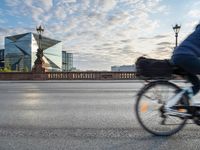 A view of Berlin at dawn, showcasing its modern architecture and urban design. The city comes to life with the movement of bicycles and incidental people. Clear skies and a bridge in the foreground add to the beauty of this European city.
