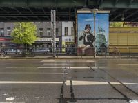 the large poster is on the side of the building by the street on a rainy day
