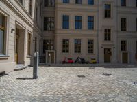 In the heart of Berlin, a classic residential courtyard with cobblestone surfaces and historic architecture. Electric charging stations blend seamlessly with urban design. Hard shadows cast on the open space bring a touch of Europe to city life.