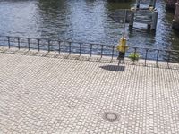 Top down view of a river in Berlin, Germany. Modern architecture lines the urban landscape, with an elevated pier providing a scenic view of the city. Grass, asphalt, and cobblestone surfaces contribute to the diverse public space.