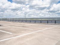 This is an image of a modern architectural scene in Berlin, Germany. The cityscape features a blend of concrete structures, including a bridge and a parking deck. The open space is adorned with well-maintained grass and lined with asphalt roads and concrete streets. The clear sky above contrasts with the cumulus clouds on the horizon. In the foreground, a fence adds a touch of urban design to the scene. Overall, this photo captures the modernity and urban charm of Berlin's architecture and infrastructure.