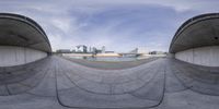 A modern skate park in Berlin, Germany, featuring a 360-degree view captured with two small fisheye lenses. The park is surrounded by a vibrant cityscape with high-rise buildings and a clear sky. The perfect spot for urban skateboard enthusiasts.