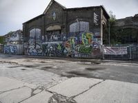 a building with lots of graffiti painted on it, along with graffiti written all over the side