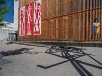 a group of people riding skateboards near wooden panels and stairss with artwork on them