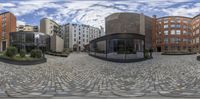 a series of circular panoramic photos of office buildings and a courtyard with a bench