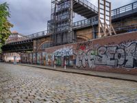 In Berlin's urban art district, graffiti covers industrial walls. Cobblestone roads lead to rugged underpasses and bridges. Vegetation adds a touch of nature to the European cityscape. A wet day in Germany's gritty manufacturing quarter.