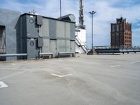 a parking lot with some sort of building in the background with a staircase leading up to it