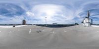 Aerial view of an empty parking lot in Berlin, surrounded by city buildings. Urban design features cobblestone surfaces and open spaces. Clouds and contrails fill the sky, creating a serene cityscape.