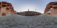 A residential area in Berlin, Germany, with modern architecture and brick walls. The cobblestone road leads through the city's urban design at dawn. Explore the European city life in Hinterhof