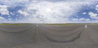 A view of Tempelhof Airport in Berlin, Germany. The straight road leads to the open space, surrounded by grass and vegetation. Clear sky and cumulus clouds create a picturesque landscape. The runway and overhead power lines add to the urban design. A perfect day for recreational activities.