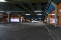 A modern architecture building in Berlin, Germany. The multicolored exterior and unique curve stands out against the urban landscape. Underground parking garage with concrete and asphalt floors. Daytime lighting fixtures add to the city's atmosphere.