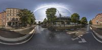 Berlin city road featuring classic architecture and asphalt surface, under a cloud-dappled sky. Urban design elements combine with shadows for a quintessential European cityscape, highlighting city life and architecture in Germany.