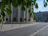 Classic architecture of Volksbühne theater in Berlin, set against a clear sky in urban Europe. Asphalt road with a distinct curb leads to the iconic one-quarter theater building. A blend of city life and urban design.