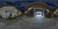 there is a view of some stairs through some windows in this panorama of the courtyard