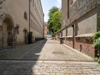 This image captures the essence of Berlin, Germany. Two men are seen walking along the cobblestone streets, surrounded by classic architecture. The building features old-fashioned windows and a distinguished design that reflects the city's rich history. The streets are lined with trees, casting shadows on the pavement. Graffiti adds a touch of urban art to the scene. This photo showcases the vibrant city life of Berlin and its unique blend of traditional and modern elements.