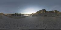 the fish eye lens shows an empty concrete street by a body of water and a city