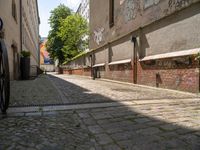 A classic Berlin neighborhood with cobblestoned paths and an apartment building. Bicycles parked along the curb add to the charm of this residential area. Hard shadows and graffiti walls capture the essence of city life in Europe.