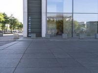 This is an image of a modern architecture building in Berlin, Germany. The high-rise condominium is located in the bustling business district of the city. The glass walls and rectangular shape of the building give it a sleek and contemporary design. The surrounding urban area is filled with trees and vegetation, providing shade and adding to the overall aesthetic of the cityscape. A clear sky can be seen above, creating a bright and inviting atmosphere. This photo captures the intersection of nature and urban design in Europe's vibrant capital city of Berlin.