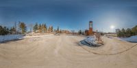 A big dirt pile next to the highway near a forest and large building, surrounded by tall trees. The clear sky and sunshine illuminate the landscape, creating a picturesque winter scene in Ontario.