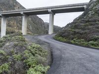 an overpass crossing over a mountain highway in the mountains below a bridge that overlooks a valley with shrubs and a small hill behind it