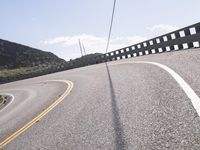 A scenic drive along the Pacific Coast Highway in Big Sur, California. The winding road hugs the coastal cliffs, offering breathtaking views of the yellow mountains and the clear blue ocean. The straight and curved lanes are lined with Armco barriers.