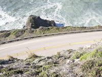 A top-down view of the Pacific Coast Highway in Big Sur, California. The road winds along the coastal cliffs, offering breathtaking views of the high mountains and the wild ocean waves. An elevated Armco barrier provides safety on this high coastal road.