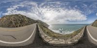 The iconic Pacific Coast Highway in Big Sur, California offers a breathtaking view of the coast. The road curves along the highland, with majestic mountains in the background and the vast ocean stretching out ahead. A perfect vacation destination.