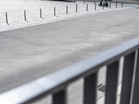 a person riding a bike on a paved area near street and a motorcycle racking area
