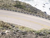 A person riding a bike on the Big Sur section of the Pacific Coast Highway in California. The road winds along the coastal landscape, offering stunning views of the ocean and mountains. The elevated road surface and Armco barrier provide safety while enjoying the scenic route.