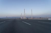 This is an image of a straight road at dawn. The asphalt road stretches into the distance, creating a motion blur effect. The clear blue sky and the horizon create a serene atmosphere. The image captures the break of day and the beginning of a new journey. The road represents an important thoroughfare and a symbol of infrastructure. This photo is perfect for any project related to travel, transportation, or the concept of moving forward.